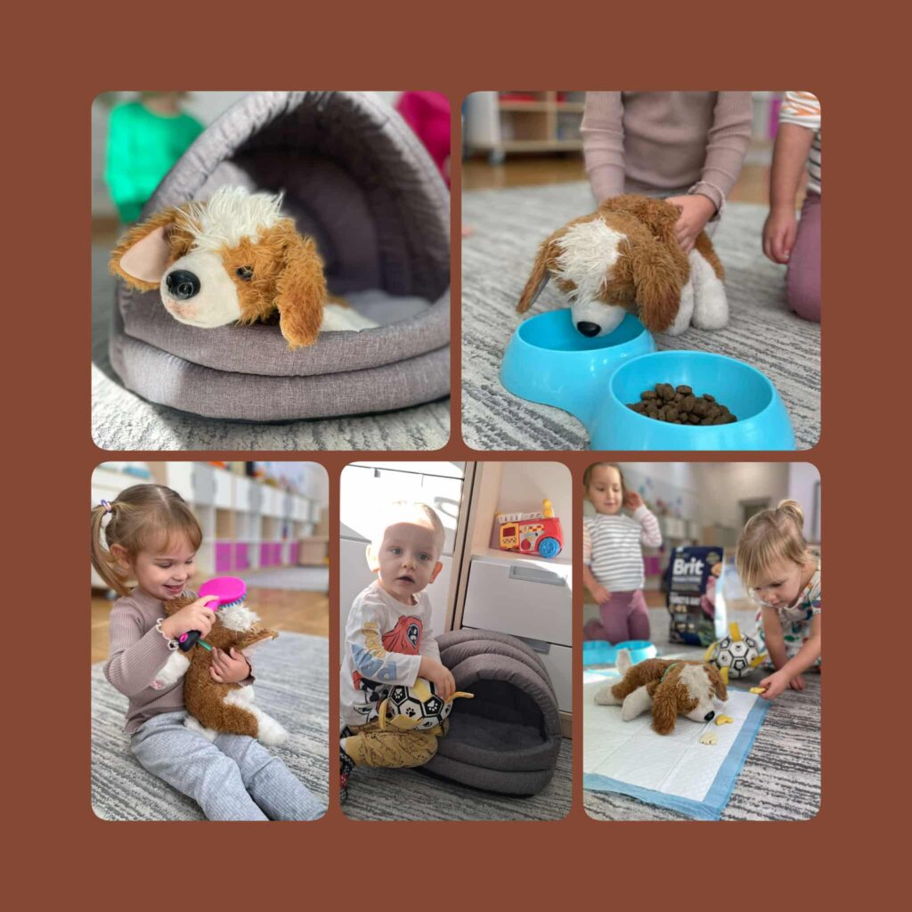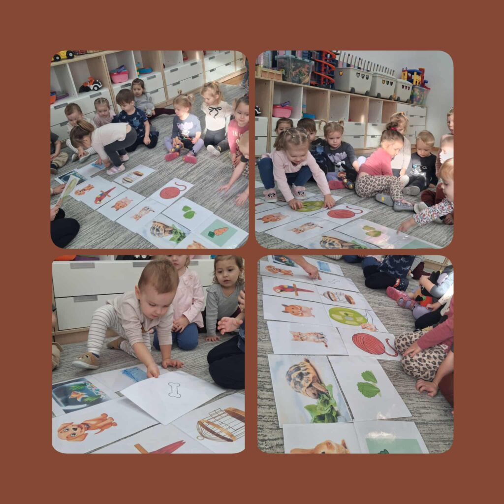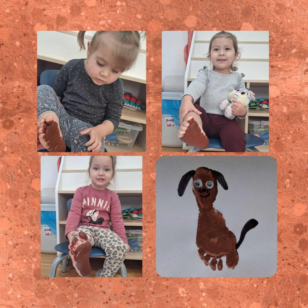 Domowi ulubieńcy ten temat wywołał wiele uśmiechów na twarzach dzieci. Kontakt ze zwierzetami uczy empatii, delikatności i odpowiedzialności. Mieliśmy okazję pobyć i pobawić się z radosnym szczeniakiem Inką. Dowiedzieliśmy się w jaki sposób trzeba nią opiekować. Następnie pomalowaliśmy stopy farbą następnie z jej odbicia wyszła postać śmiesznego pieska. Poznaliśmy zwierzęta, które mogą stać się naszymi domowymi pupilami i odkrywaliśmy je na zajęciach sensorycznych.