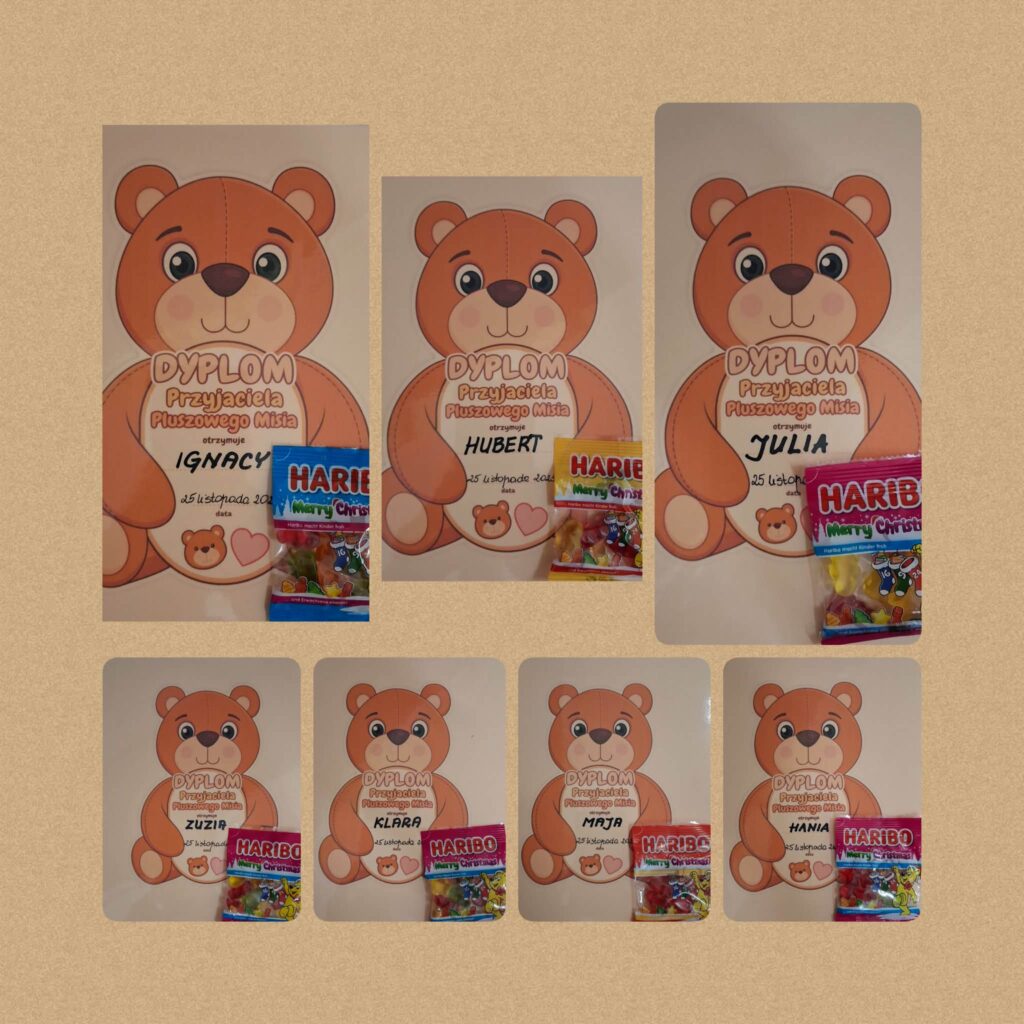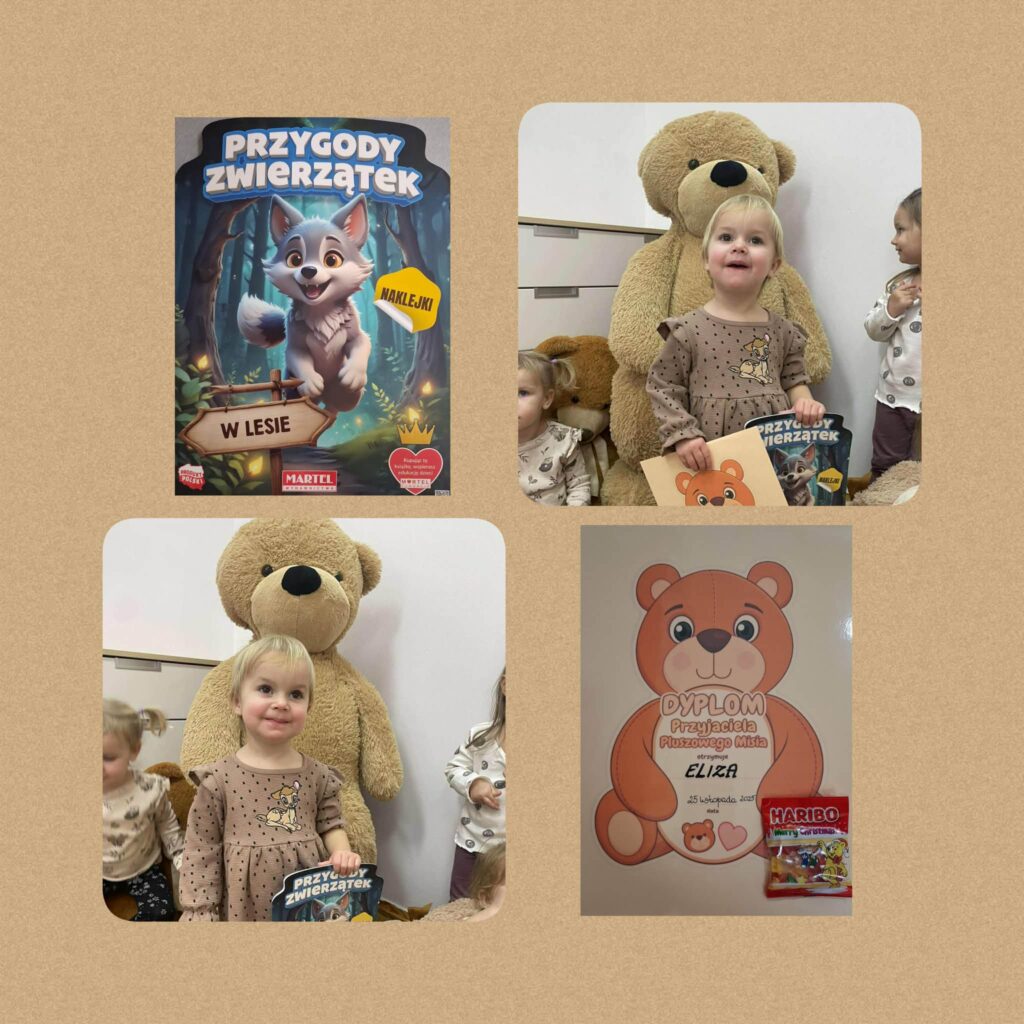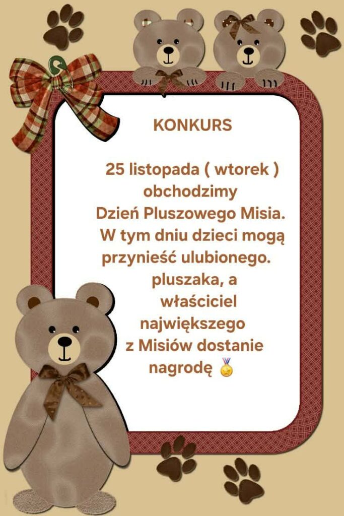 25 listopada obchodziliśmy Dzień Pluszowego Misia. Z tej okazji każdy przyniósł swojego ulubionego pluszaka. Odbyło się małe przedstawienie pt. “Kto misiowi urwał ucho?” próbowaliśmy jak smakuje przysmak misiów, czyli miodek. Konkurs na największego misia wygrała Elizka. Dla wszystkich dzieci mamy dyplomy oraz upominki.